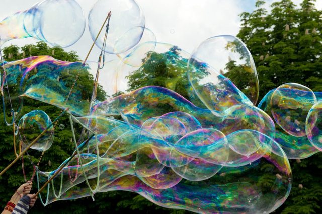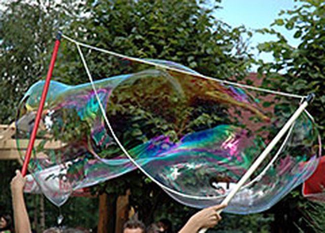 Die Schnur in Seifenlauge eintauchen, Stockenden geschlossen lassen und Schnur herausziehen. Stockenden vorsichtig öffnen und die Seifenblase entsteht. Stockenden vorsichtig schließen und die Blase wird abgeschlossen.