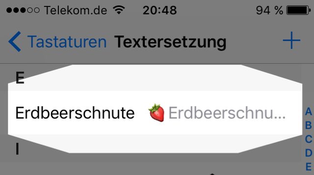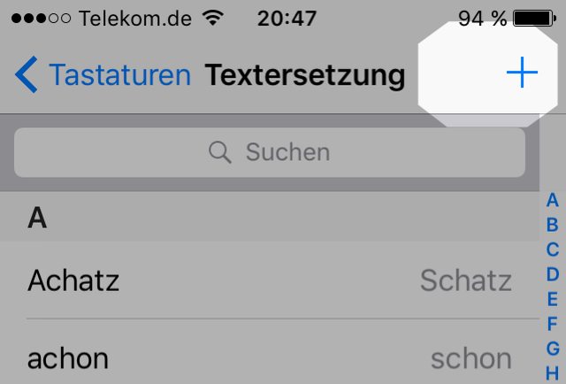 Jetzt ist da eine Liste mit den bisher schon hinterlegten Textersetzungen und Shortcuts.